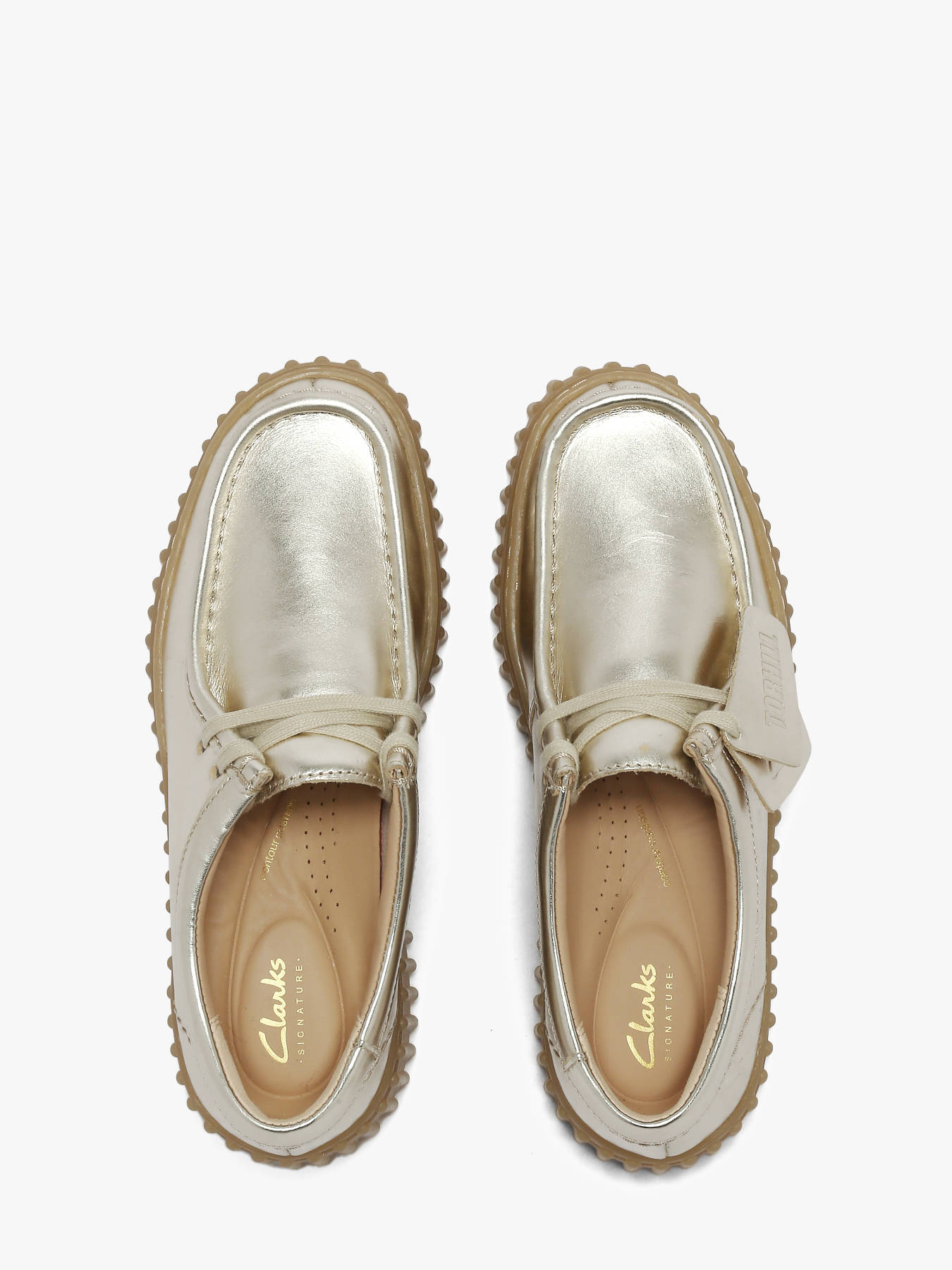 Les derbies Torhill Bee de Clarks pour femme en cuir doré illuminent vos silhouettes avec une touche audacieuse et contemporaine. Leur semelle extérieure épaisse et nervurée, directement issue des archives de la marque, affirme un caractère fort tout en restant résolument moderne. Le design épuré à lacets dessine des courbes harmonieuses pour une silhouette structurée et facile à porter au quotidien. Le cuir doré apporte éclat et originalité, transformant un modèle casual en véritable pièce mode. Confortables et stables, elles s’inscrivent dans l’héritage Clarks tout en revendiquant une esthétique tendance. Les Torhill Bee sont idéales pour celles qui souhaitent twister leurs looks avec une chaussure à la fois patrimoniale, lumineuse et pleine de personnalité.
